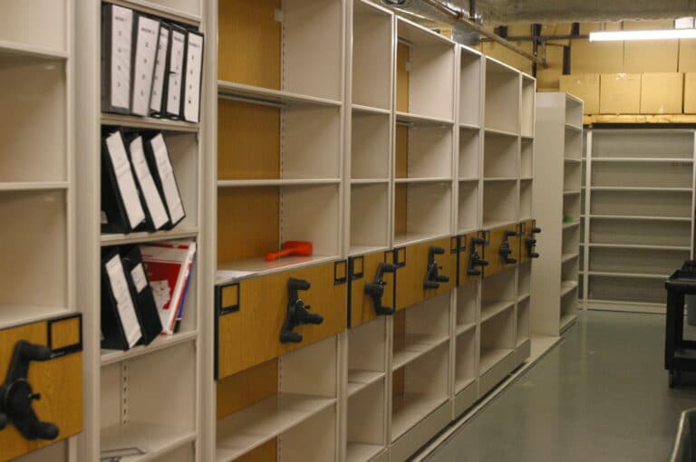That movement allows shelves to be stacked side by side. The shelves are moved as needed to create a walkway into the desired section.